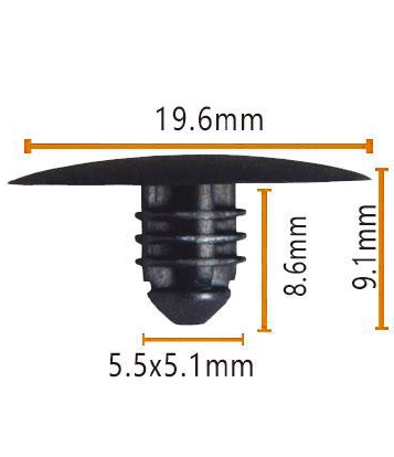 Die Oberseite dieser Schraube ist flach ausgelegt, mit einem Durchmesser von 19,6 mm und einer Länge von 8,6 mm, um eine enge Passform mit allen Teilen des Fahrzeugs zu gewährleisten. Der erhöhte Teil in der Mitte hat einen Durchmesser von 5,5 mm und eine Höhe von 5,1 mm. Dieses einzigartige Design verbessert nicht nur den Anzieheneffekt der Schraube, sondern macht den Installationsprozess auch reibungsloser. Der Boden ist eine flache runde Basis mit einem Durchmesser von 9,1 mm, der eine stabile Unterstützung für die Schraube bietet. Die Gesamtgröße ist deutlich markiert, was für Sie bei der Verwendung schnell identifiziert und auswählen kann.