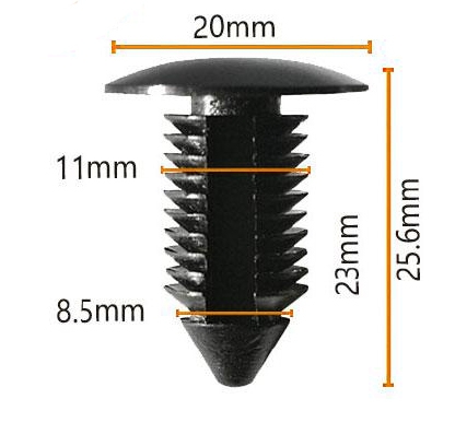 Die Gesamtlänge des Befestigers beträgt 25,6 mm, die Breite 20 mm und die Kopfhöhe 11 mm.